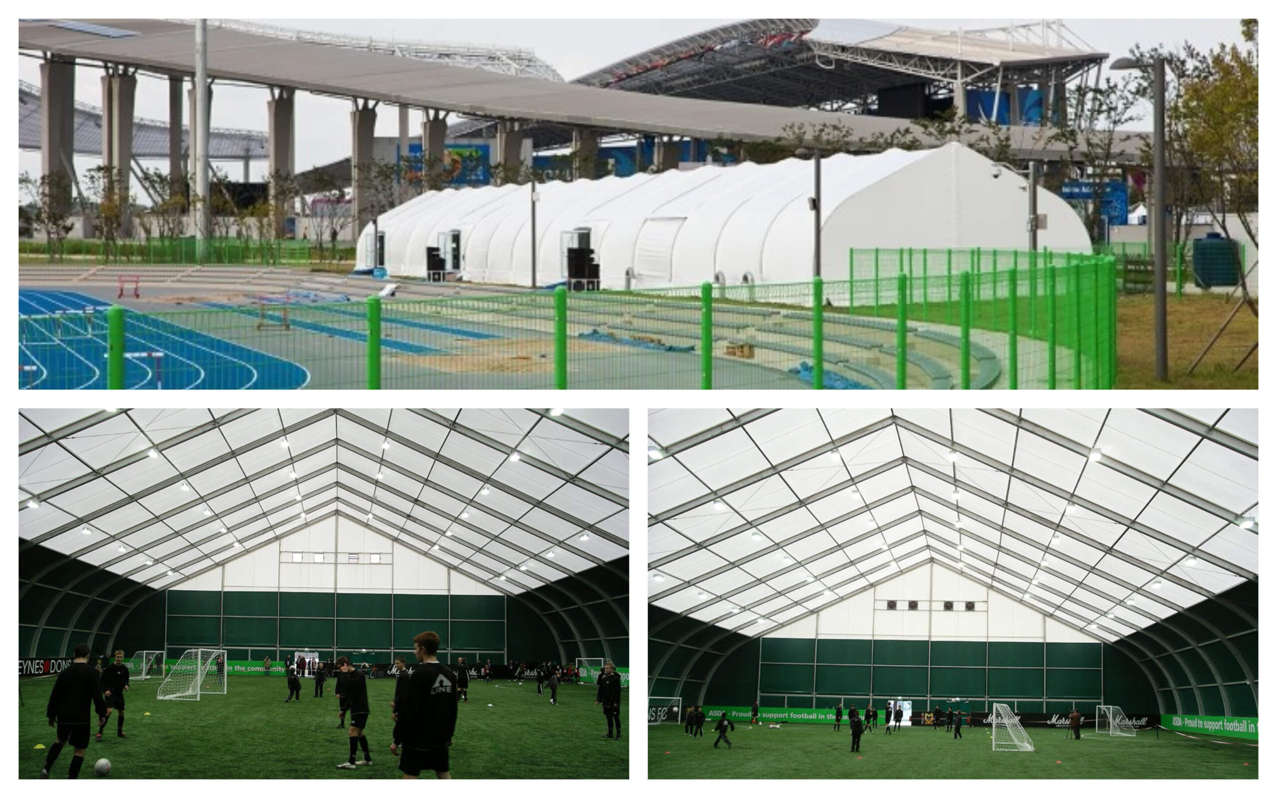 Soccer field TFS Curved Tents, no pillar support inside, no obstruction, the athletes can play inside to their heart’s content. All frame profiles are made of high quality aluminum alloy, which is beautiful and safe, and can effectively guarantee the smooth holding of events. The perimeter can be made of double-sided coated PVC tarpaulin or ABS and other hard walls to ensure the safety of the athletes in a variety of adverse weather conditions.