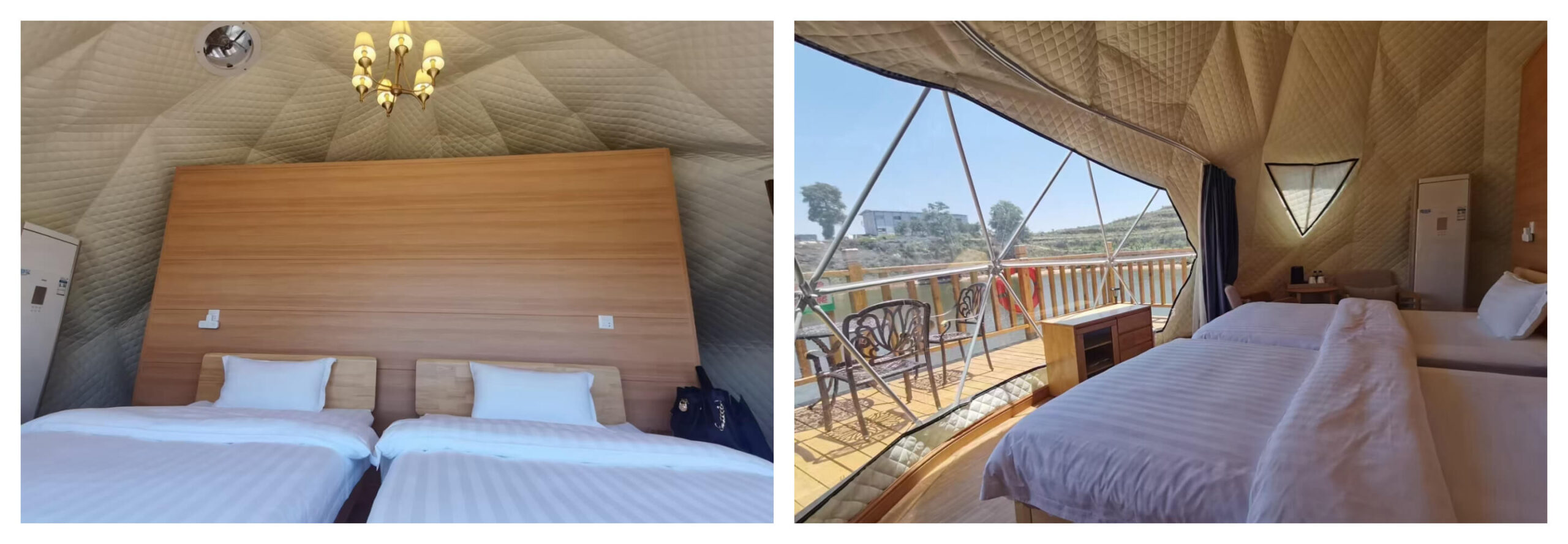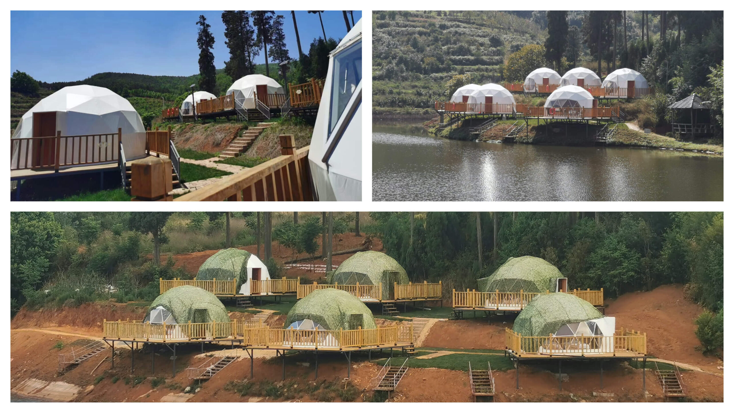 Yuntu has built a total of 12 units geodesic dome tents on both sides of the farm, including the construction of wood deck, which designs and install bathroom, toilet, water and electricity system. In order to make dome tents look more luxurious. YunYu has equipped geodesic dome tents with glass windows and smart glass door for this farm glamping. Considering that dome tents is near the lake, YunYu has done a good job of moisture-proof, and metal frame is a painted hot-dip galvanized pipe fitting. Each geodesic dome tent has a certain distance to ensure the privacy of residents.