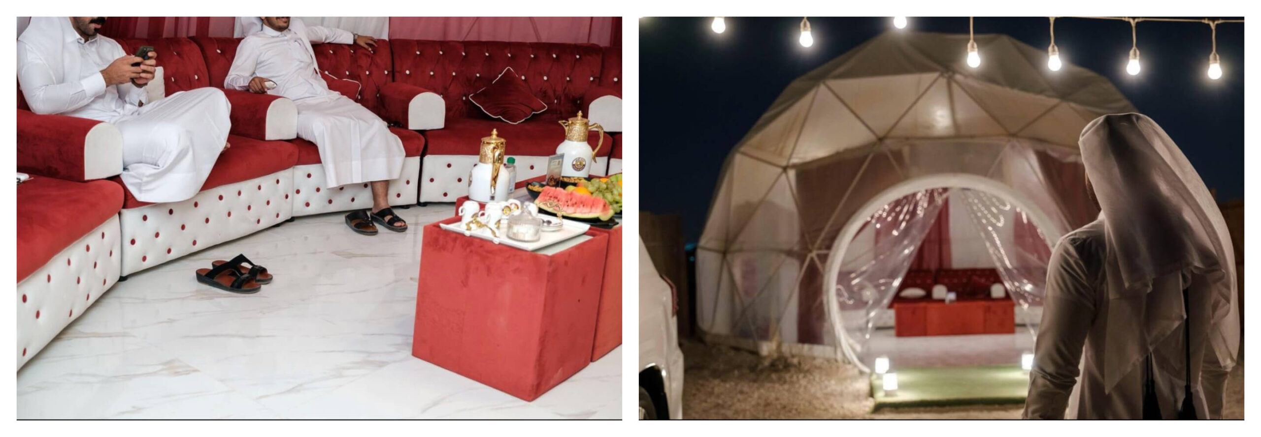 The design of dome tent is half transparent PVC fabric and half white PVC fabric. The transparent area is decorated with red window screens to experience the warm and romantic style of Arabia.