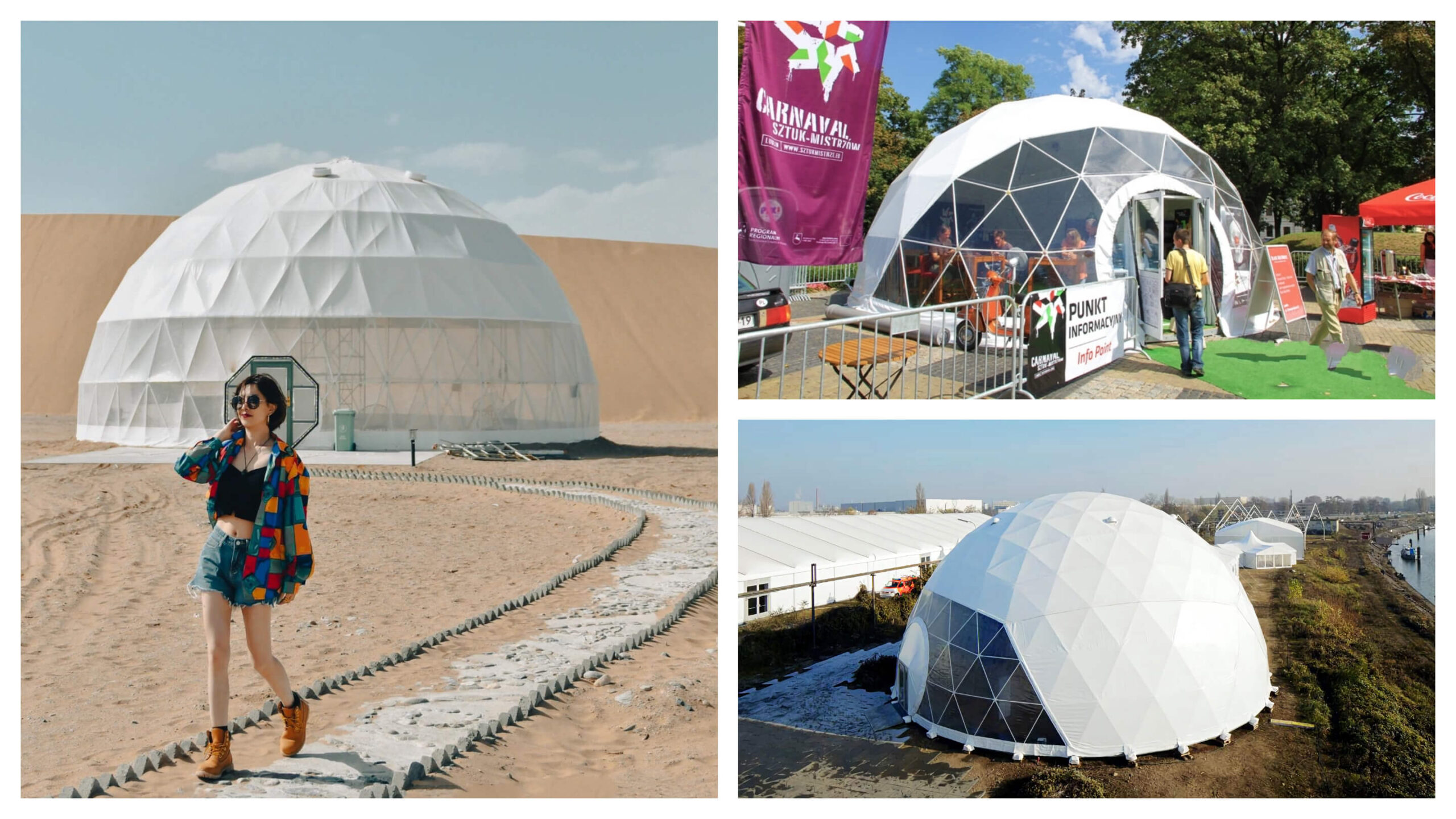 The geodesic dome tent has its unique design concept, novel structure, safety and other unique charm, especially to attract the public eye, it can create the perfect solution for your special events. It widely used in various large-scale exhibitions, wedding, party, events, celebrations, outdoor activities. Its unique and beautiful shape and changeable tarpaulin design style make geodesic dome tent a choice for high-end users who advocate high quality and highlight brand charm.