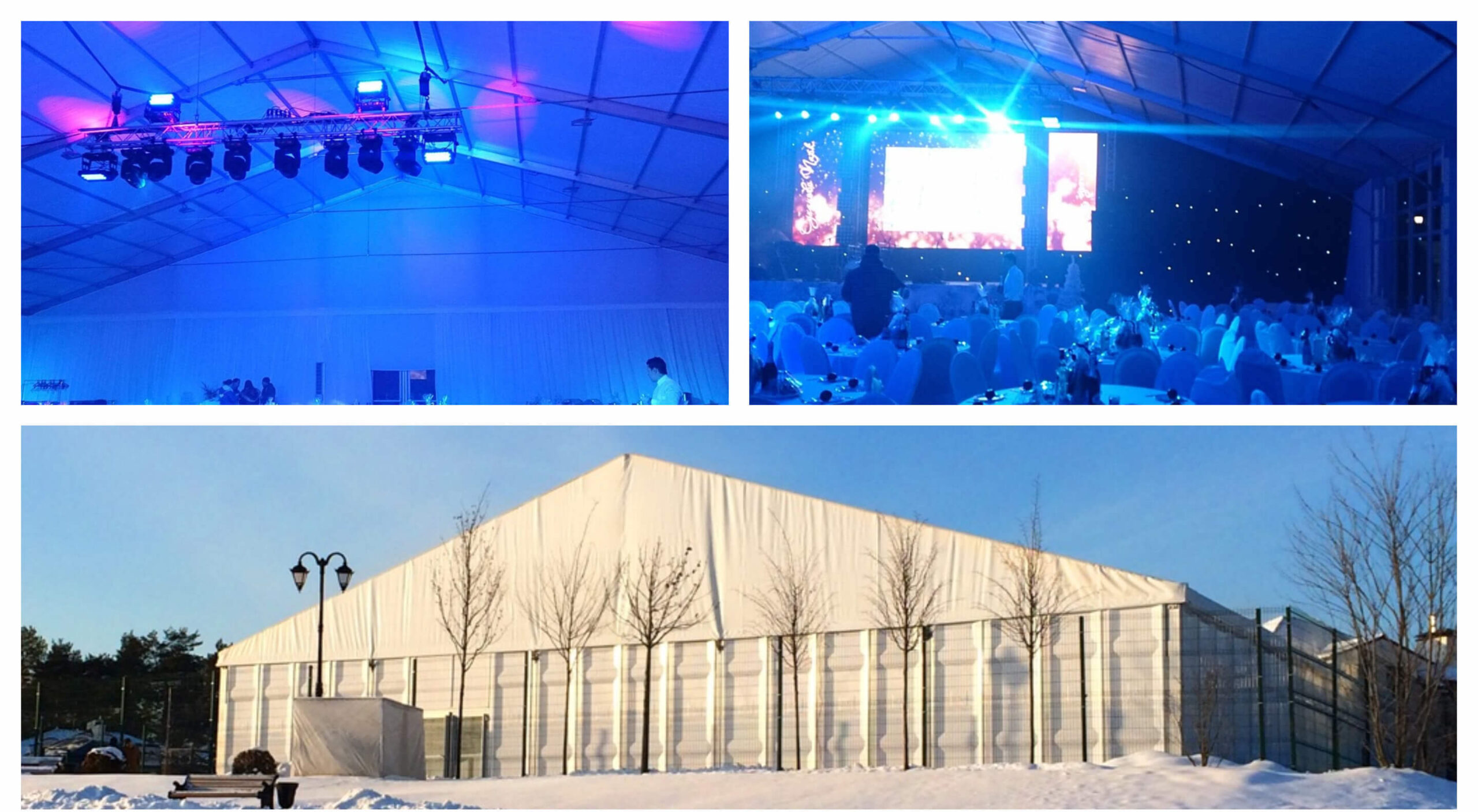 Solution: As part of the solution, a temporary comprehensive party tent was built. The main exhibition hall is equipped with a temporary big party tent building with a total area of 750 square meters. The internal functional areas include cloakroom, buffet area and welcome area. In the field of technology , two pagoda tents are also set up as auxiliary tents, which function as sign in area and waiting rest area. The hot air gun is installed indoors, and the door curtain is installed at the entrance to keep the indoor temperature comfortable. The difficulty of installation is to install the temporary party tent on the rough tennis court and use the floor and ballasting system for installation and fixation. YunTu was installed the party tents at – 24¡æ, which is a great challenge.