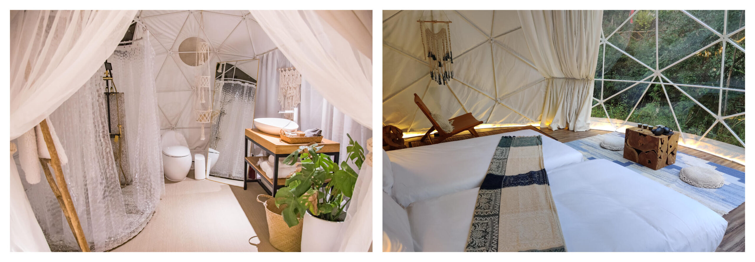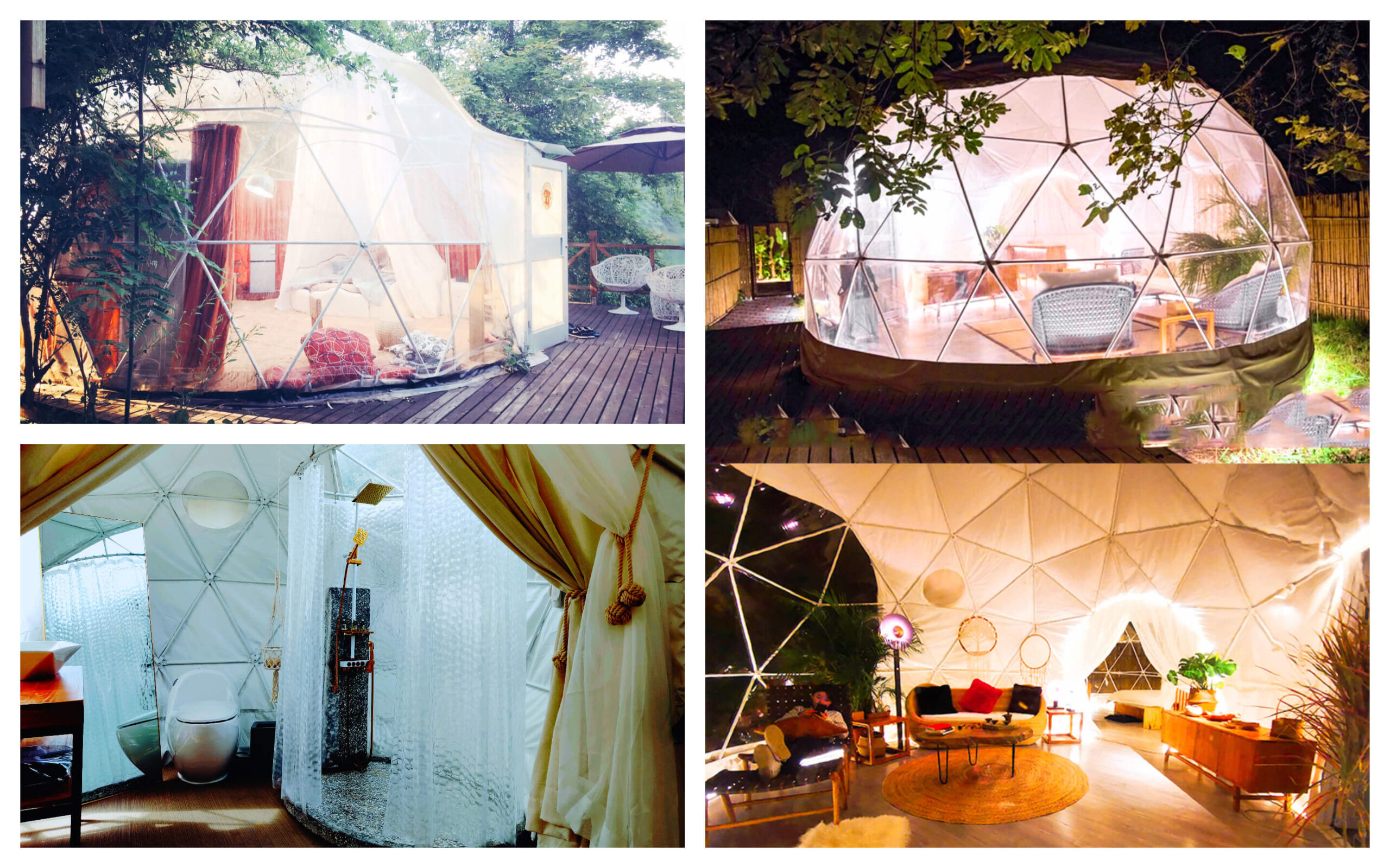 Unload the fast-paced fatigue in the steel and concrete, are you looking forward to a slow down “light travel”? Together with the scene, slowly spend leisure time, away from the hustle and bustle of the metropolis for a short while, living a few enjoyable days. Healing life at the same time, also heal ourselves. The dome tents are like stars scattered among the foot of the mountains by the stream, and each dome tent has an excellent open view. Lying on the sofa, enjoying the stream and the lush greenery of the mountains through the dome tent, taking a nap in the courtyard at night, swinging in the rocking chairs and counting the stars with the evening breeze, it’s really very romantic 🙂