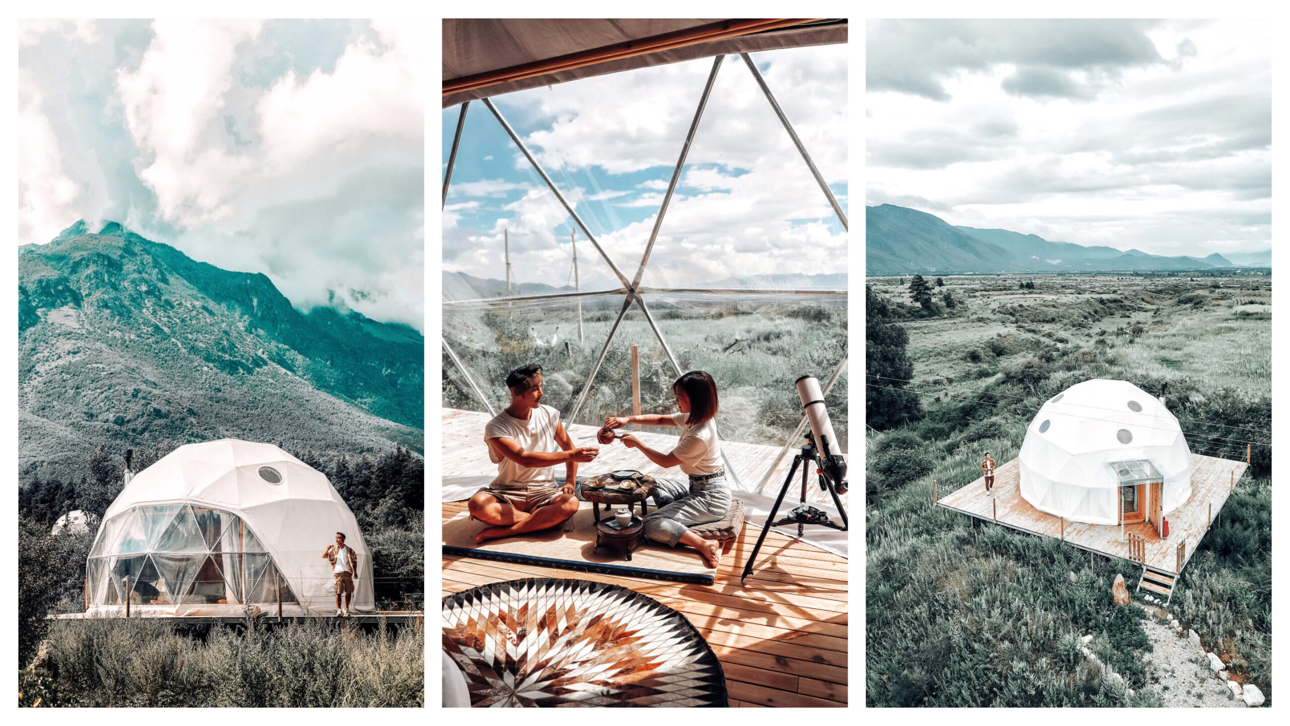 The site is located in the beautiful Yunnan province, full of Chinese ethnic charm. 12 stars glamping geodesic dome tents, full of romance and wild luxury space, with white domes stand out in the green valley. This glamping dome tents are arranged according to the height of the mountain to ensure that each one gets the most open stargazing view. The overall style inside dome tents is light, bright and very cozy.