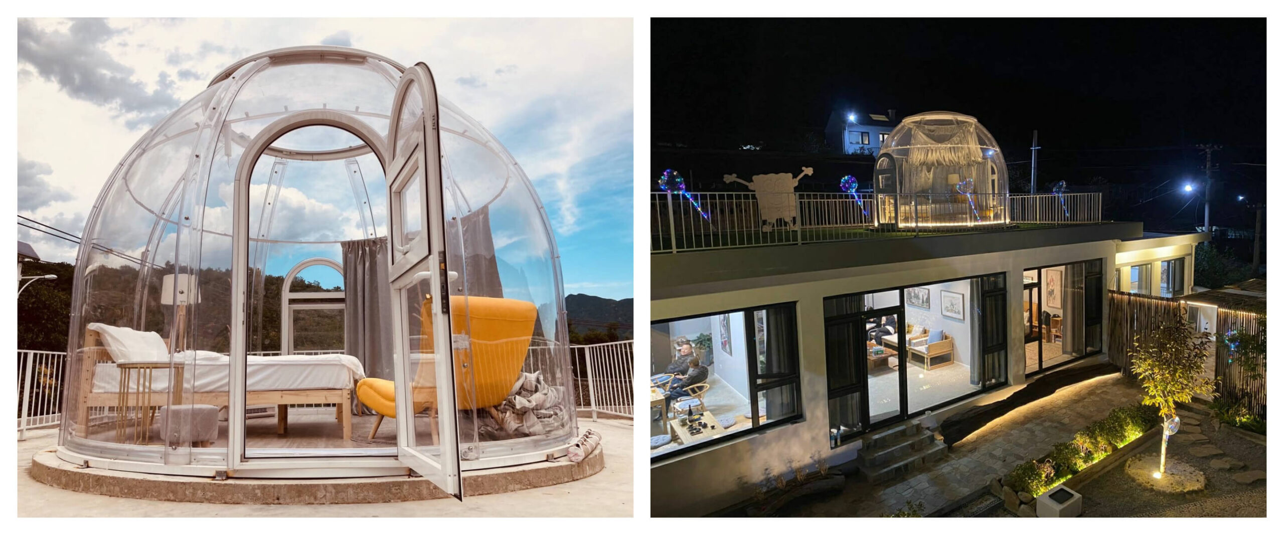 The transparent PC dome tents are not only hard to burn but enjoy super waterproof that no amount of rain will enter the interior of the room. Except for the wind resistance feature which uses the streamlined shape of the dome protects it from direct wind. In addition, the legs of these components are safely buried in the foundation so it can withstand even very violent typhoons. What’s more, the physical insulation of the star room reflects back some of the light while installing heat cooling equipment for energy-saving and cooling purposes.